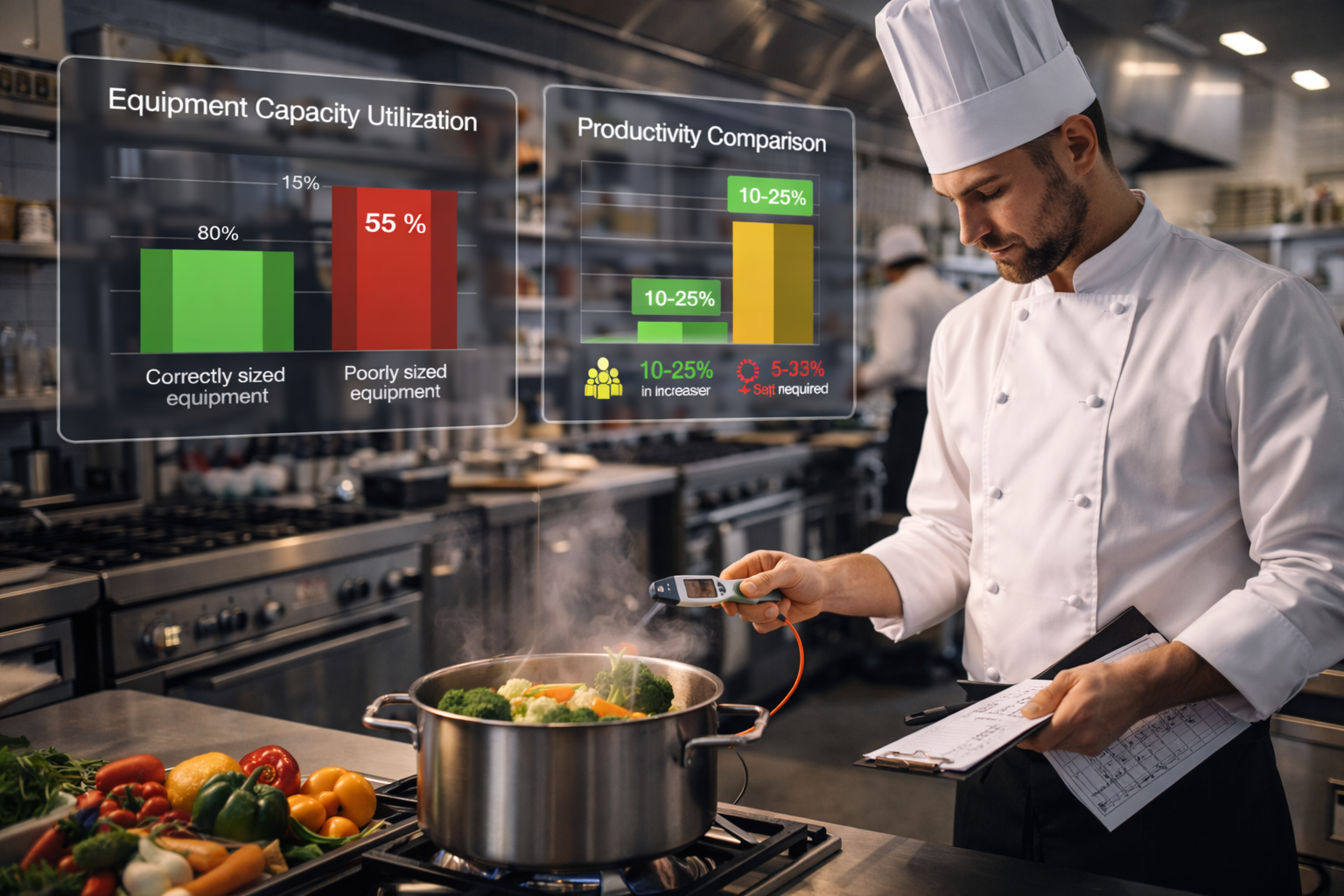 Estudos de eficiência operacional mostram que cozinhas com equipamentos subdimensionados apresentam: